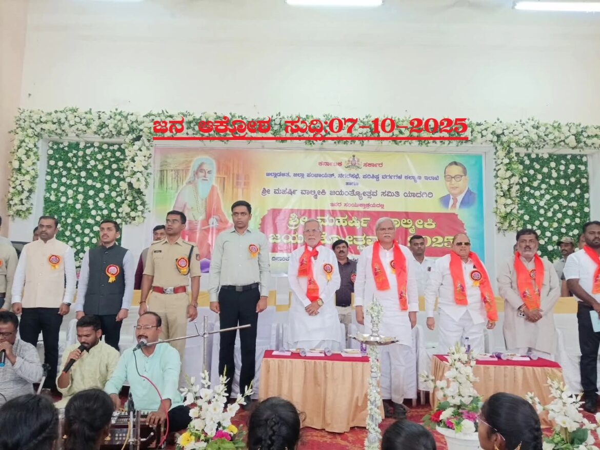 ಯಾದಗಿರಿ: ಜಿಲ್ಲಾಡಳಿತ, ಜಿಲ್ಲಾ ಪಂಚಾಯತ್, ನಗರಸಭೆ, ಪರಿಶಿಷ್ಟ ವರ್ಗಗಳ ಕಲ್ಯಾಣ ಇಲಾಖೆ ಹಾಗೂ ಮಹರ್ಷಿ ಶ್ರೀ ವಾಲ್ಮೀಕಿ ಜಯಂತ್ಯೋತ್ಸವ ಸಮಿತಿಗಳ ಸಂಯುಕ್ತಾಶ್ರಯದಲ್ಲಿ ನಗರದಲ್ಲಿ ಮಹರ್ಷಿ ಶ್ರೀ ವಾಲ್ಮೀಕಿ ಜಯಂತಿಯನ್ನು ಅದ್ದೂರಿಯಾಗಿ ಆಚರಿಸಲಾಯಿತು.