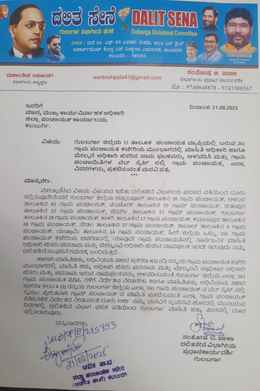 ಮಾಹಿತಿ ಹಕ್ಕು ಅಧಿನಿಯಮ 2005ರ ಪ್ರಕಾರ, ಸರ್ಕಾರದ ಎಲ್ಲಾ ಇಲಾಖೆಗಳು, ನಿಗಮಗಳು ಮತ್ತು ಅನುದಾನ ಪಡೆಯುವ ಸಂಸ್ಥೆಗಳು ಸಾರ್ವಜನಿಕ ಮಾಹಿತಿ ಅಧಿಕಾರಿ, ಸಹಾಯಕ ಸಾರ್ವಜನಿಕ ಮಾಹಿತಿ ಅಧಿಕಾರಿ ಹಾಗೂ ಮೇಲ್ಮನವಿ ಪ್ರಾಧಿಕಾರಿಗಳನ್ನು ಕಡ್ಡಾಯವಾಗಿ ನೇಮಿಸಬೇಕು. ಜೊತೆಗೆ, ಅವರ ಹೆಸರು ಮತ್ತು ಹುದ್ದೆಗಳನ್ನು ಕಚೇರಿಗಳ ಸೂಚನಾ ಫಲಕದಲ್ಲಿ ಪ್ರದರ್ಶಿಸಬೇಕು. ಆದರೆ, ಕಲಬುರಗಿ ಜಿಲ್ಲೆಯ 261 ಗ್ರಾಮ ಪಂಚಾಯತ್ಗಳಲ್ಲಿ ಈ ನಿಯಮವನ್ನು ಪಾಲಿಸಿಲ್ಲ ಎಂಬುದು ದಲಿತಸೇನೆಯ ವಿಭಾಗೀಯ ಘಟಕದ ಗಮನಕ್ಕೆ ಬಂದಿದೆ.