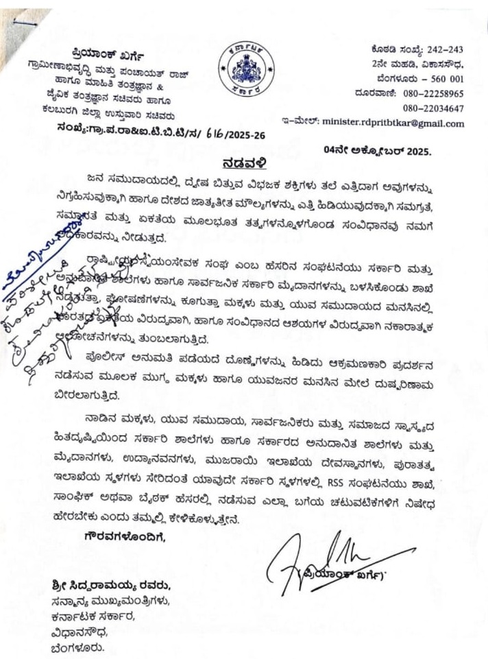 ಕೋಮು ದ್ವೇಷ ಹರಡುತ್ತಿರುವ RSS: ನಿಯಂತ್ರಿಸಲು ಸಿಎಂಗೆ ಸಚಿವ ಪ್ರಿಯಾಂಕ್ ಖರ್ಗೆ ಪತ್ರ