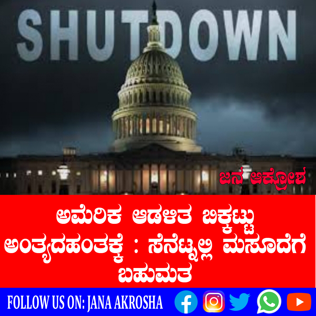 ಬುಧವಾರ ಅಮೆರಿಕ ಸಂಸದರು ಸರ್ಕಾರದ ಆಡಳಿತ ಬಿಕ್ಕಟ್ಟನ್ನು ಅಂತ್ಯಗೊಳಿಸುವ ಮಸೂದೆಗೆ ಪರವಾಗಿ ಮತ ಚಲಾಯಿಸಿದರು. ಅಧ್ಯಕ್ಷ ಡೊನಾಲ್ಡ್ ಟ್ರಂಪ್ ಅವರ ಸಹಿಯೊಂದಿಗೆ ಈ ಮಸೂದೆ ಕಾನೂನಾಗಿ ಜಾರಿಯಾಗಲಿದ್ದು, ಸರ್ಕಾರದ ಕಾರ್ಯಚಟುವಟಿಕೆಗಳು ಪುನರಾರಂಭವಾಗಲು ದಾರಿ ಸುಗಮವಾಗಲಿದೆ.