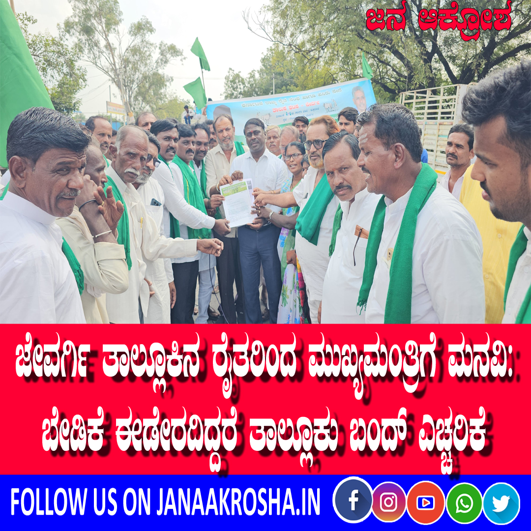 ಜೇವರ್ಗಿ: ಕಲಬುರಗಿ ಜಿಲ್ಲೆಯ ಜೇವರ್ಗಿ ತಾಲ್ಲೂಕಿನಲ್ಲಿ ಅತಿವೃಷ್ಟಿಯಿಂದ ಬೆಳೆ ನಷ್ಟವಾಗಿ ತೀವ್ರ ಸಂಕಷ್ಟಕ್ಕೆ ಸಿಲುಕಿರುವ ರೈತರು, ತಮ್ಮ ವಿವಿಧ ಬೇಡಿಕೆಗಳ ಈಡೇರಿಕೆಗಾಗಿ ಕರ್ನಾಟಕ ರಾಜ್ಯ ರೈತ ಸಂಘ ಹಾಗೂ ಹಸಿರು ಸೇನೆ ಸಂಘಟನೆ ವತಿಯಿಂದ ಮಾನ್ಯ ಮುಖ್ಯಮಂತ್ರಿಗಳಿಗೆ ಮನವಿ ಪತ್ರ ಸಲ್ಲಿಸಿದ್ದಾರೆ. ಬೇಡಿಕೆಗಳನ್ನು ಕೂಡಲೇ ಬಗೆಹರಿಸದಿದ್ದರೆ ಜೇವರ್ಗಿ ತಾಲ್ಲೂಕು ಬಂದ್ ಮಾಡಿ ರಾಜ್ಯ ಸರ್ಕಾರದ ವಿರುದ್ಧ ತೀವ್ರ ಹೋರಾಟ ನಡೆಸುವುದಾಗಿ ಎಚ್ಚರಿಕೆ ನೀಡಿದ್ದಾರೆ.